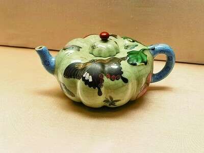 一元复始,万象更新。春天是生机勃勃、万物复苏、草木萌芽的季节,因此,展厅中不少文物装饰有花鸟瓜果图案,春意浓浓。展厅中,清代豆青釉蜂蝶图瓜式茶壶抓住了记者的眼球。这只小小的仿南瓜形小壶,把手上还长出了两片叶子,别具情趣;壶身装饰着大小不一、五彩斑斓、翩翩飞舞的蝴蝶和蜜蜂,逼真生动,似乎随时要振翅飞出。这把壶生动地呈现了春到人间,蜂飞蝶舞,“蜂也喧喧,蝶也翩翩”的场景,同时,“瓜蝶”谐音“瓜瓞”,有繁衍不绝、生生不息之意。