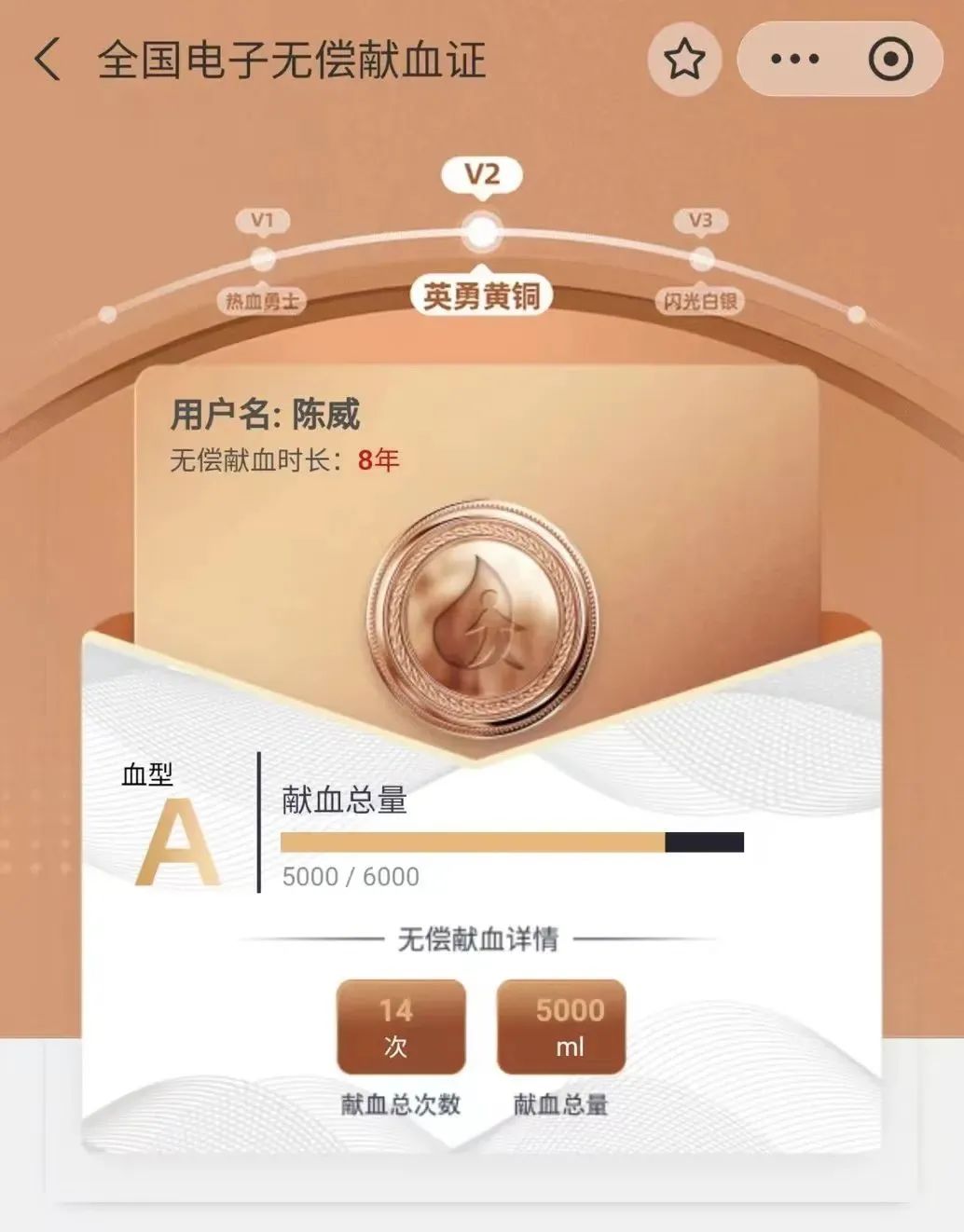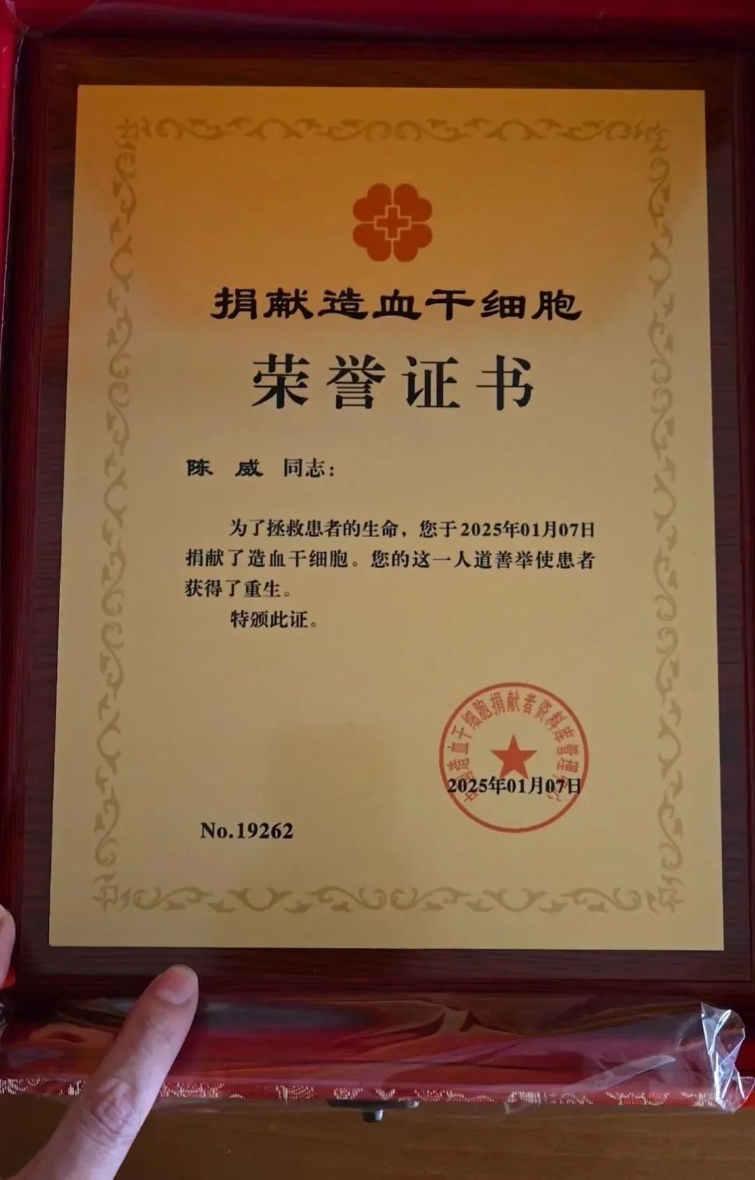 除了此次造血干细胞的捐献,陈威还是一位长期无偿献血的志愿者,8年来,已累计捐献了25个单位的全血,用自己的实际行动生动诠释了公益的力量与奉献精神的崇高价值。