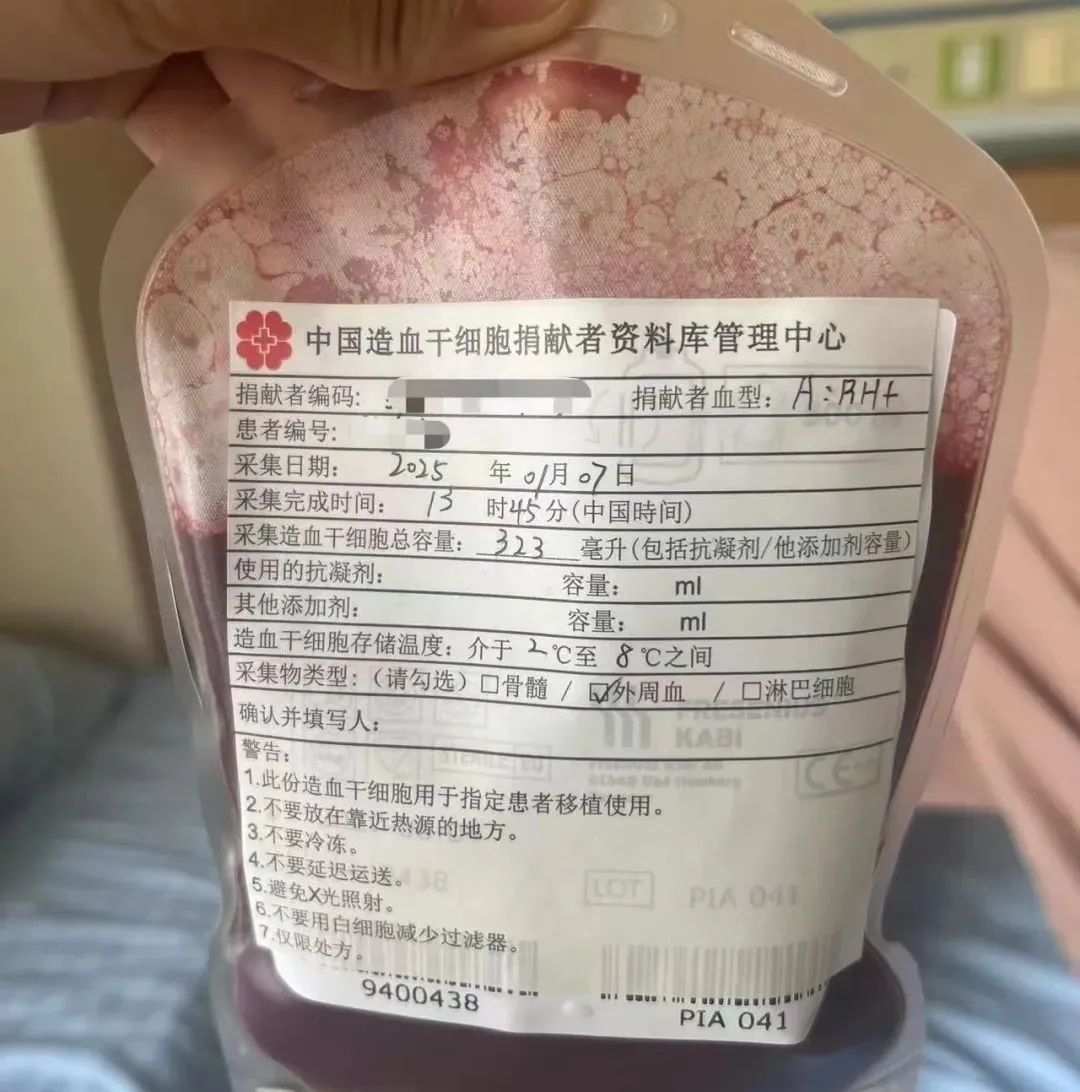 捐献过程远比想象中复杂艰辛。由于捐献对象是成人,为了保障足以提供患者移植所需的造血干细胞数量,1月3日到1月7日,陈威在5天内注射了10针动员剂。捐献当天,经过长达5个半小时的捐献,最终成功采集了323ml的造血干细胞混悬液,这份珍贵的礼物被迅速送往医院,为等待移植的成人患者带来新的生命希望。