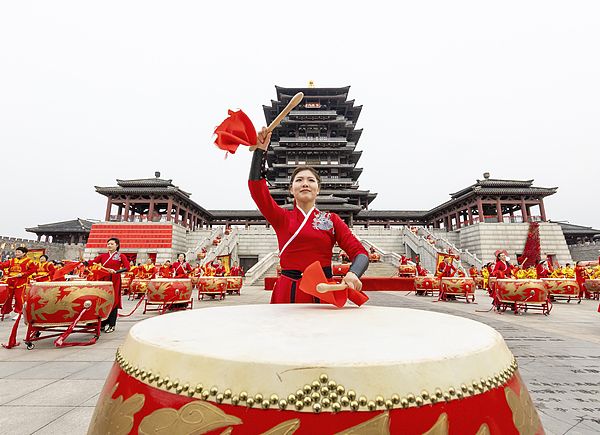 2024年1月25日,江苏省宿迁市泗洪县古徐阁景区,鼓声震撼,来自全县10支锣鼓队百面锣鼓现场精彩演绎,喜迎新春佳节。