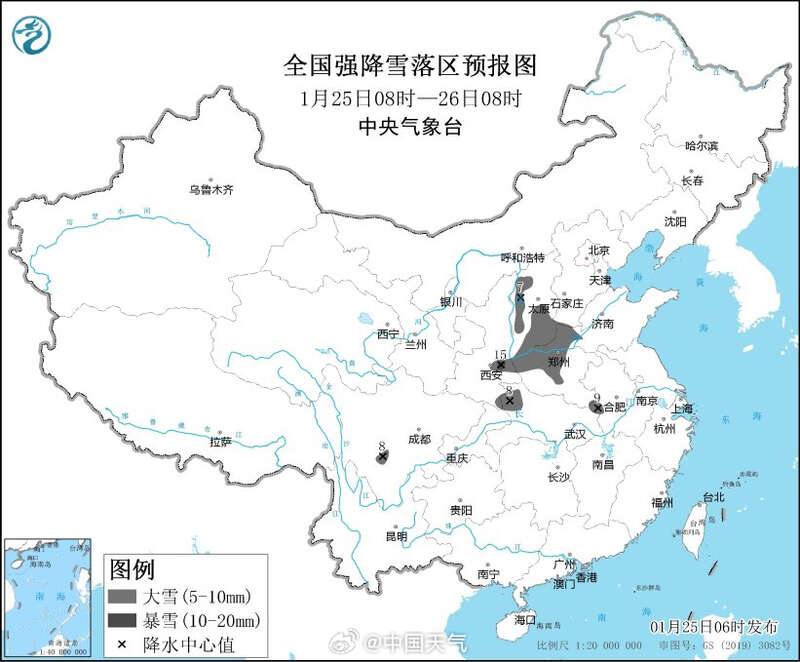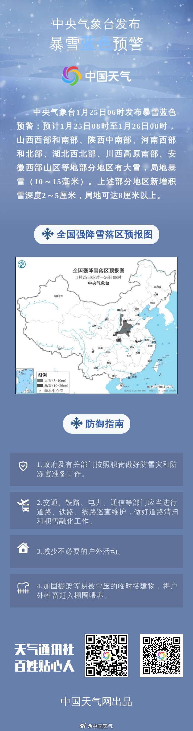 暴雪→25日至26日,山西、陕西、河南、湖北、川西高原、安徽西部山区等地部分地区有大雪,局地暴雪。