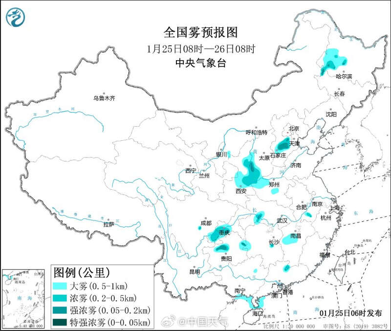 大雾→25日早晨至上午,黑龙江西南部、河北中部、河南西部、陕西中北部、山西西南部、重庆西南部等地的部分地区有大雾。
