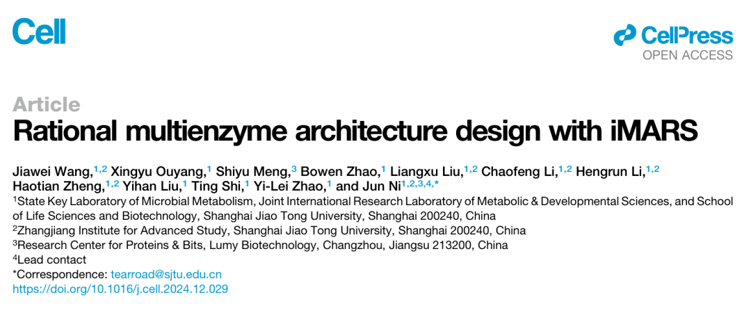 2025年1月24日,上海交通大学生命科学技术学院/张江高等研究院合成科学创新研究中心倪俊副教授课题组在Cell上发表题为“Rational multienzyme architecture design with iMARS”的论文, 揭示多酶空间邻近性和效率的“密码”,解决了50多年以来多酶组装无标准的难题,实现人工多酶复合体序列到功能的理性设计 。