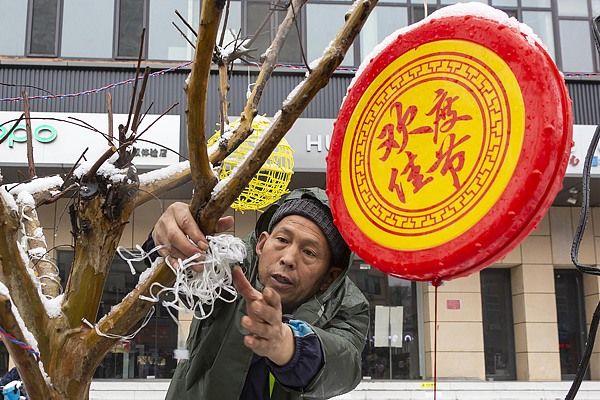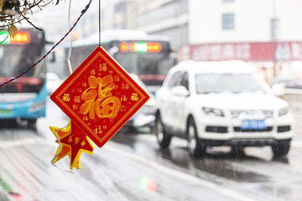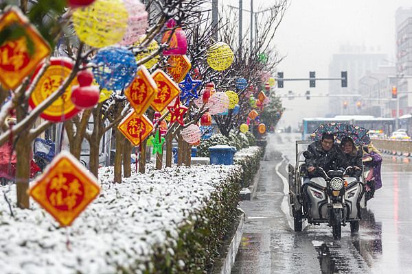 2025年1月25日,在山西省运城市中心城区市民、车辆冒雪从布满花灯的街道上经过。 蛇年春节将至,山西省运城市一场降雪给城市、村庄披上了“银装”,工人们冒雪在城市街头布置悬挂节日花灯成了一道风景,一街一景的节日花灯在瑞雪的映衬下,营造出了独特喜迎新春的节日气氛。