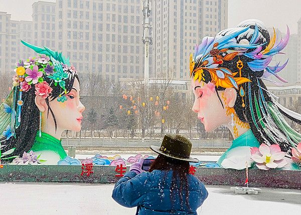 2025年1月25日,内蒙古呼和浩特迎来降雪天气,在玉泉区塞上老街旅游休闲街区、小黑河景观带,新春花灯与雪花相映成趣,美轮美奂。