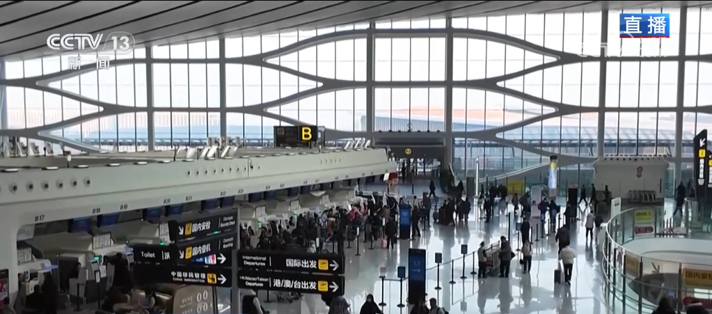 记者来到大兴机场航站楼内,一进来就能深切感受到春运的火热氛围。根据之前机票销售的情况来看,1月25日是节前春运出行的最高峰,也就是说今天坐飞机的人会最多。根据大兴机场方面的预测,机场预计运送进出港旅客15.4万人次。我们看到,现在各值机柜台前都排起了长龙,值机柜台前基本上排队的旅客在十多个人。不仅仅是国内航线出行量大,不少旅客都选择“探亲+旅游”的方式,所以国际航线的出入境人数也大幅上涨。