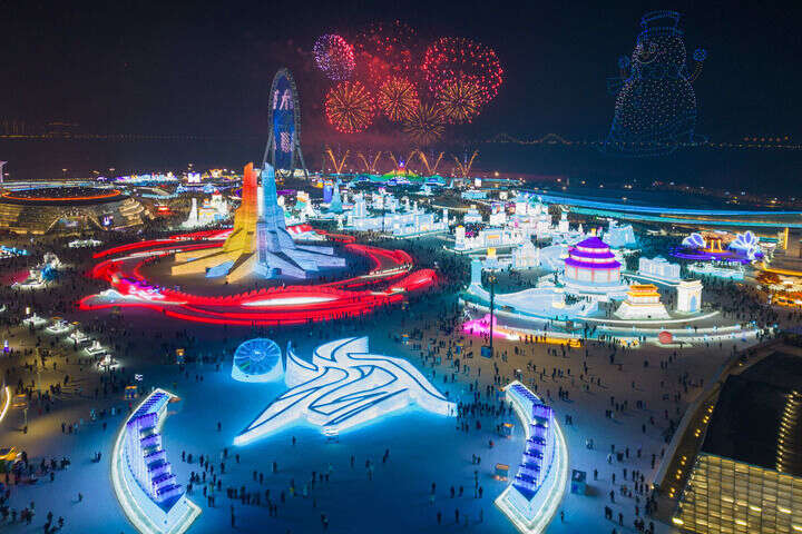 在黑龙江哈尔滨冰雪大世界,人头攒动,开园第20天,入园游客量就突破100万人次;