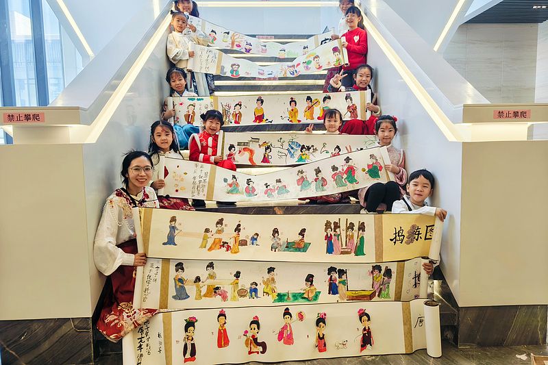 2025年1月26日,乌鲁木齐,孩子和家长在新疆维吾尔自治区博物馆展示文化作品。
