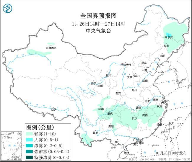 26日夜间至27日早晨,全国无大范围雾霾天气。仅黑龙江中部的部分地区有能见度低于1公里的大雾。