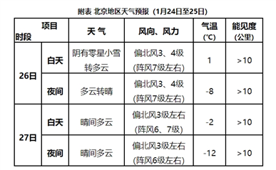 26日白天大部地区有零星小雪,夜间天气逐渐转晴。受强冷空气影响,26-27日有3~4级偏北风,阵风7级左右。期间气温下降,白天最高气温1~-2℃,夜间最低气温-8~-12℃。