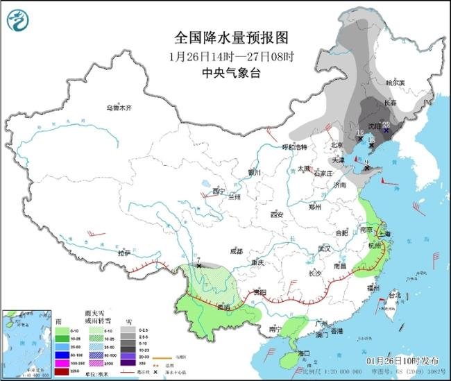 1月26日14时至27日8时,内蒙古中东部、东北地区西北部和中南部、华北中东部、山东中北部、四川南部、云南北部、贵州西北部等地部分地区有小到中雪或雨夹雪,内蒙古东部、辽宁、吉林南部、山东半岛北部等地部分地区有大到暴雪,局地大暴雪(20~25毫米)。江淮、江南中东部、云南中南部、华南等地有小雨,云南南部部分地区有中雨。
