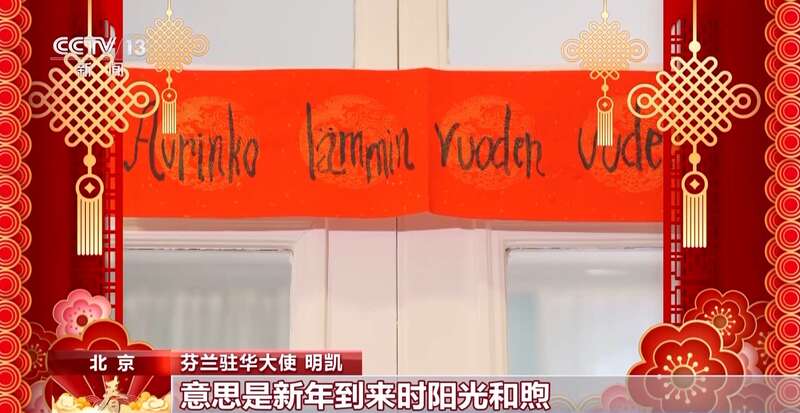 芬兰驻华大使 明凯:上面(横批)写的是“日暖岁新”,意思是新年到来时阳光和煦。
