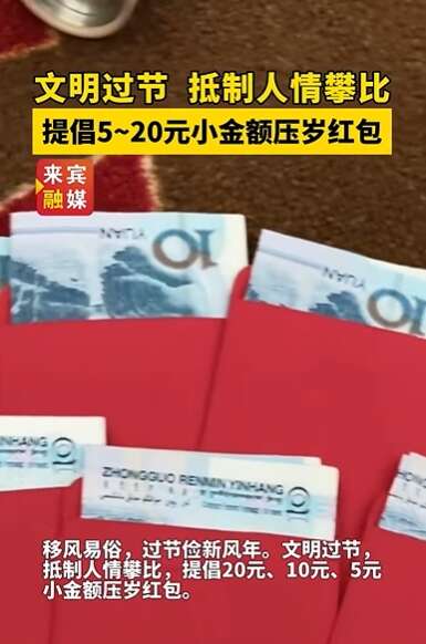 稍早前,广西百色市委宣传部、市精神文明办已于1月7日呼吁:压岁钱是长辈给予晚辈的新年岁礼,不是亲友之间互相攀比的“面子钱”,不提倡向直系亲属之外的其他亲朋好友发压岁钱,勿让压岁钱成为人情往来的负担。