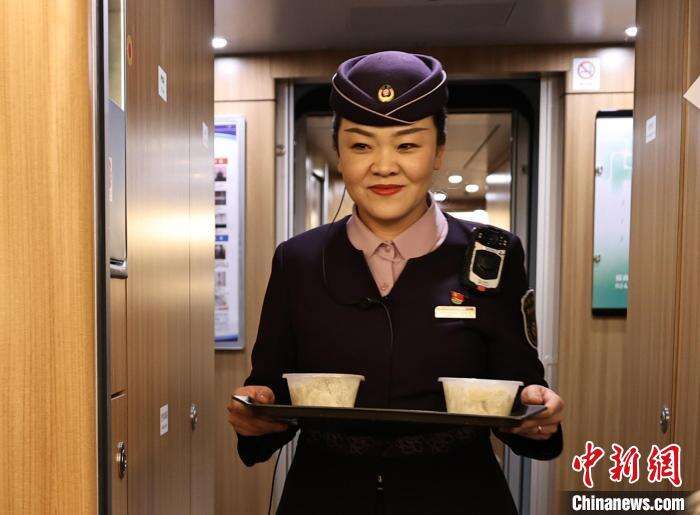 图为列车长庞轶欣给旅客送饺子。中新社记者 于海洋 摄