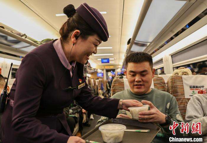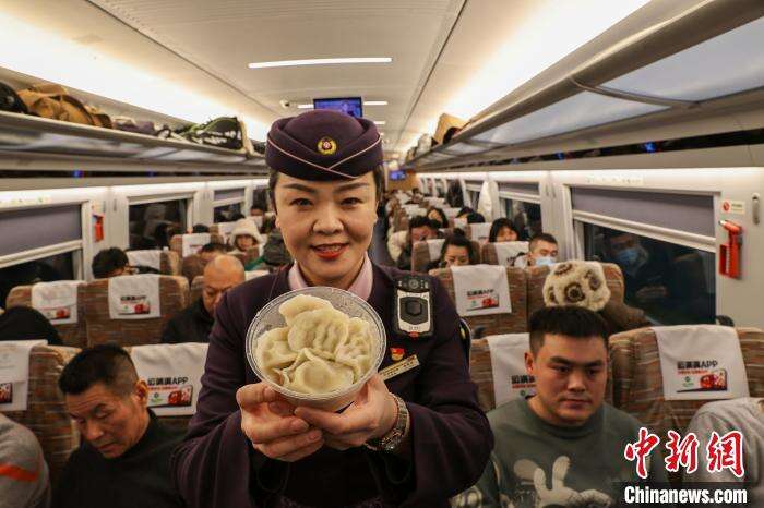 1月28日,农历除夕,由中国铁路沈阳局集团有限公司沈阳客运段动车二队担当的上海虹桥至丹东G1229次列车上,G1229次列车长庞轶欣为旅客送上热腾腾的饺子,让旅客在高铁上感受着浓浓的年味儿,共庆春节到来。图为列车长庞轶欣给旅客送饺子。中新社记者 于海洋 摄