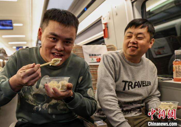 除夕夜旅客在高铁上吃饺子迎春节