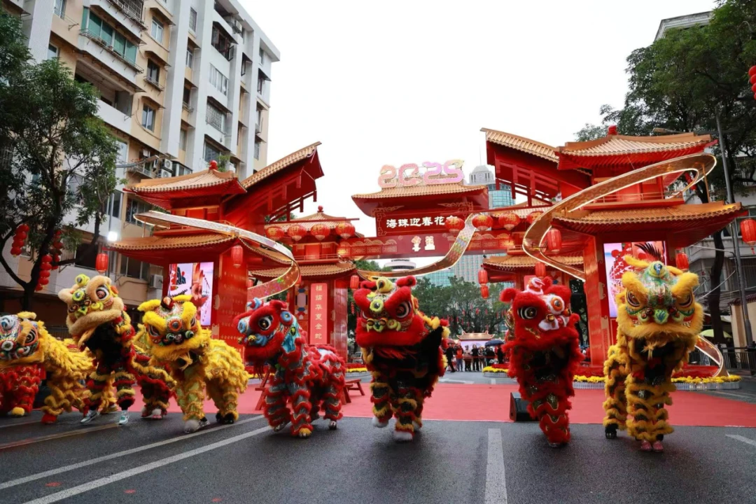 锣鼓声响,醒狮起舞。1月26日上午,2025年广州市海珠区迎春花市(简称“海珠花市”)开市仪式举行。海珠花市主牌楼以“海港古韵,灵蛇献瑞”为灵感,保留传统建筑韵味的同时融入现代设计元素,呈现广州市海珠区兼具历史底蕴与创新活力的城市面貌。