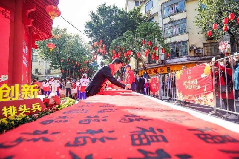 英歌舞起, 心随韵动,今年的开市仪式新增英歌舞表演,舞动间诉说着千年的故事。英姿飒爽的演员们手持英歌槌一同参与巡游表演,与市民开展亲切互动,增添浓厚节日气氛,为市民游客朋友带来不一样的花市体验。活动现场还安排多名书法家现场挥毫,书写的“福”字赠与现场市民并合影,营造祥和、欢乐的节日气氛。