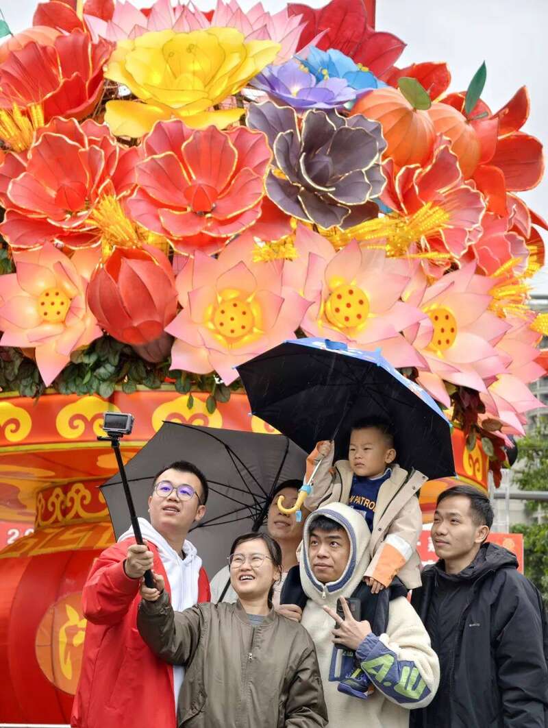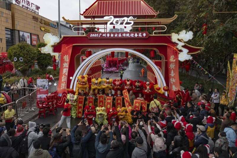 1月22日,2025年广州市南沙区迎春花市(简称“南沙花市”)暨南沙街道花灯游启动仪式开幕。市民游客纷纷驻足看瑞狮,与瑞狮进行互动,摸一摸瑞狮,博一个“摸摸红狮头,鸿运当头;摸摸金狮尾,年头旺到年尾”的好彩头。
