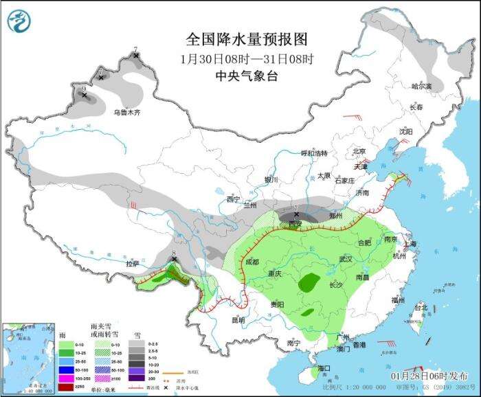 1月30日08时至31日08时,新疆北部、内蒙古东北部、黑龙江、西藏北部和东部、西北地区东部、华北西南部、黄淮西部、川西高原北部等地的部分地区有小到中雪或雨夹雪,其中,新疆北疆北部和伊犁河谷、西藏东部、陕西中部、河南西部等地的部分地区有大雪(5~9毫米)。西藏东南部、西北地区东南部、西南地区东部、江淮大部、江汉、江南北部和西部、华南北部等地的部分地区有小到中雨。内蒙古东南部、辽东半岛、山东半岛等地的部分地区有4~6级风。