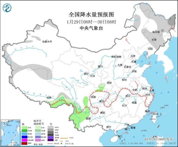1月29日08时至30日08时,新疆北部和西南部山区、内蒙古东北部、黑龙江、吉林、西藏北部和东部等地的部分地区有小到中雪或雨夹雪。四川南部、云南中西部等地的部分地区有小雨。内蒙古中部、辽东半岛、山东半岛等地的部分地区有4~5级风。