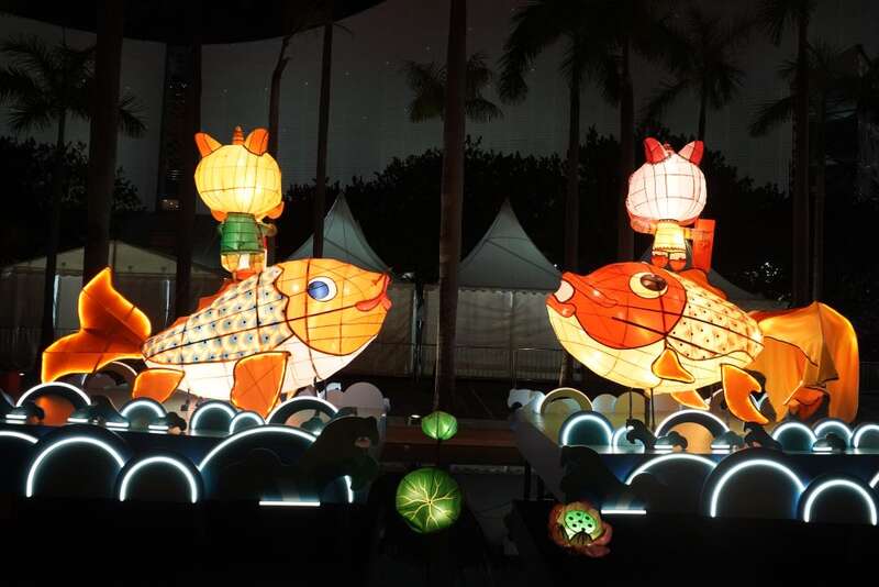 香港文化中心露天广场上,一组由香港非物质文化遗产办事处策划的扎作彩灯与四周景色相映成趣,锦鲤与金鱼在水池上跃动,小醒狮站在鱼背上嬉戏。