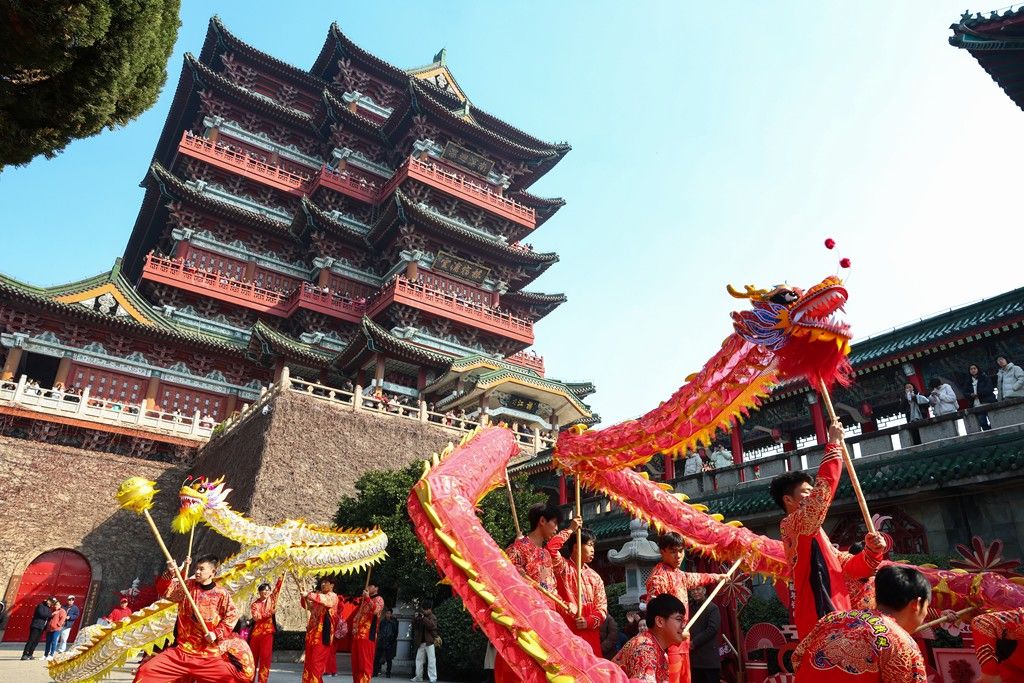 2025年1月29日,正值农历正月初一,南昌滕王阁景区推出新春系列活动,游客们在此感受滕王阁的古韵与风貌,体验红火热闹中国年。图为舞龙队伍表演。 中新社记者 刘思伟 摄