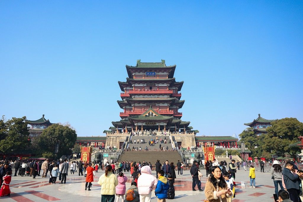2025年1月29日,正值农历正月初一,南昌滕王阁景区推出新春系列活动,游客们在此感受滕王阁的古韵与风貌,体验红火热闹中国年。图为滕王阁前游人如织。 中新社记者 刘思伟 摄