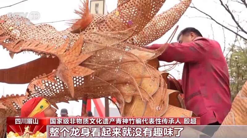 据介绍,“竹龙”由龙头、龙骨、龙尾、龙翼组装而成,采用国家级非遗青神竹编工艺。其中,龙骨架以当地慈竹为原材料,经32道工序制作而成。在“竹龙”的制作过程中,龙头是最难也是最关键的一环。