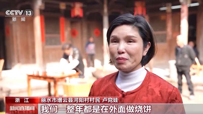 丽水市缙云县河阳村村民 卢窕娃:我们一整年都是在外面做烧饼,每年过年的时候我们都会回到家乡来,做烧饼给家里人吃,然后看到小孩子们吃得这么开心,我心里也特别高兴。