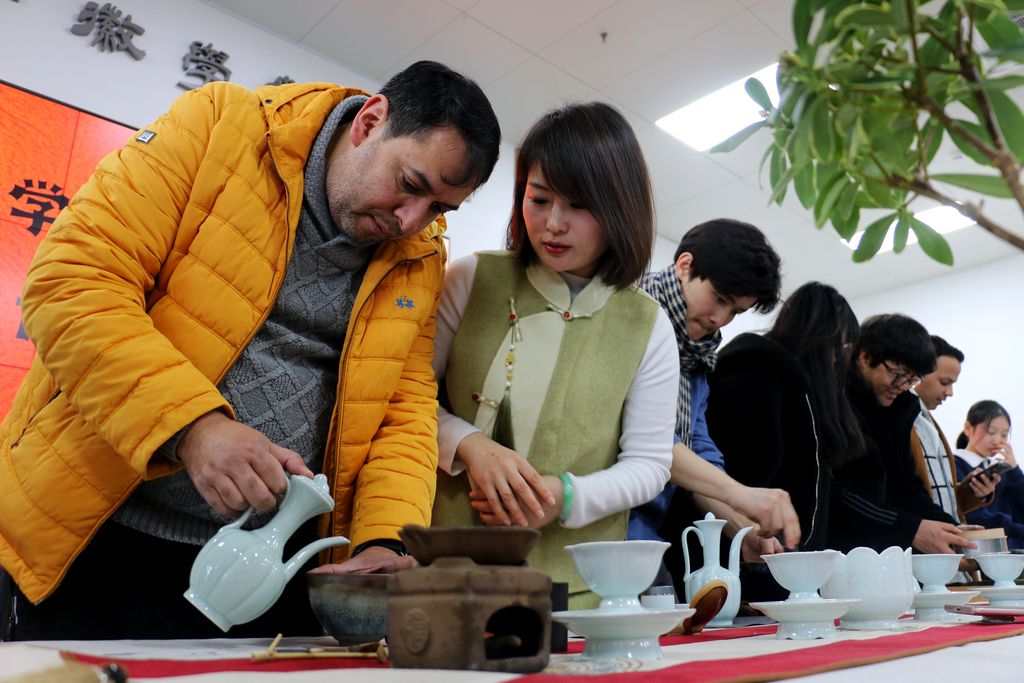 2025年1月29日,合肥,来自俄罗斯、马来西亚、智利等20多个国家的100余名在皖留学生和外籍教师来到安徽博物院,参加“博物馆里过大年——留学生专场活动”,了解安徽文化,打卡非遗体验活动。图为留学生们在体验点茶技艺。 中新社记者 张强 摄