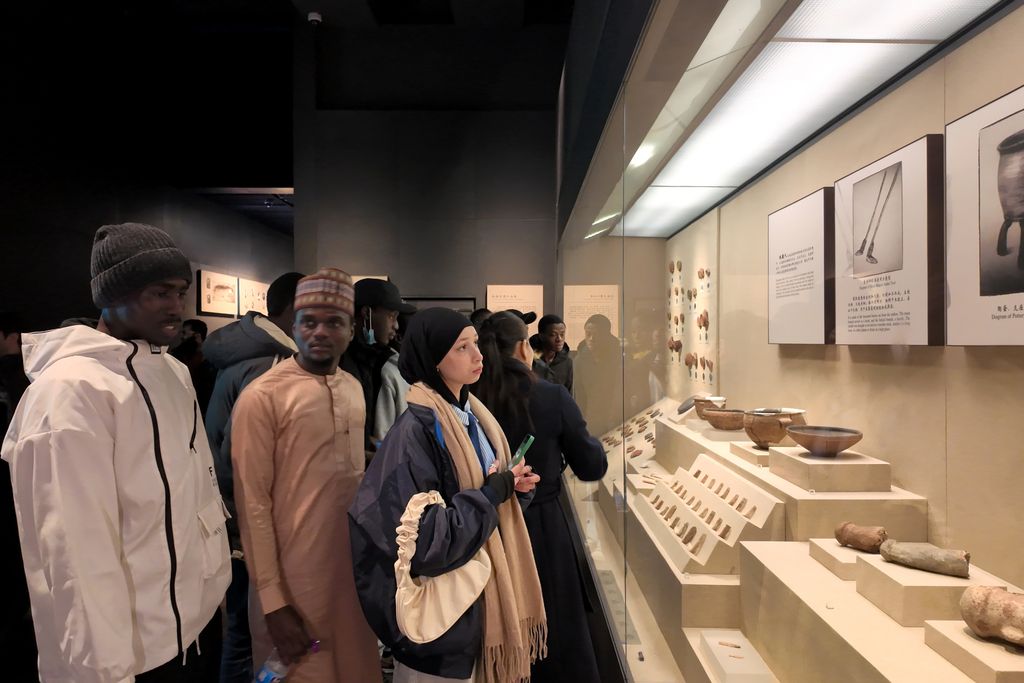 2025年1月29日,合肥,来自俄罗斯、马来西亚、智利等20多个国家的100余名在皖留学生和外籍教师来到安徽博物院,参加“博物馆里过大年——留学生专场活动”,了解安徽文化,打卡非遗体验活动。图为留学生们参观安徽博物院“安徽文明史陈列展”。 中新社记者 张强 摄