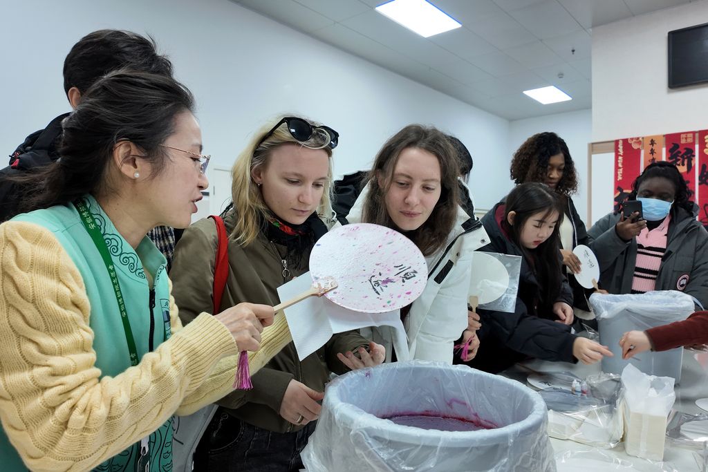 2025年1月29日,合肥,来自俄罗斯、马来西亚、智利等20多个国家的100余名在皖留学生和外籍教师来到安徽博物院,参加“博物馆里过大年——留学生专场活动”,了解安徽文化,打卡非遗体验活动。图为留学生们在体验漆扇制作技艺。 中新社记者 张强 摄