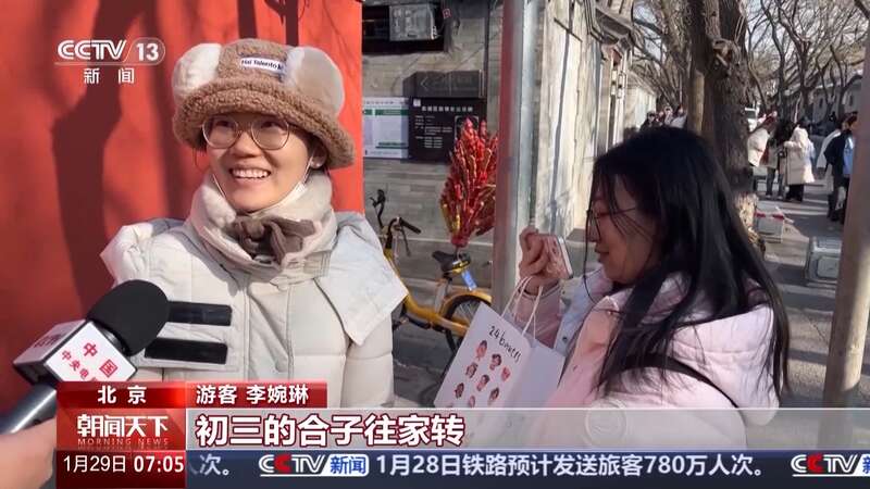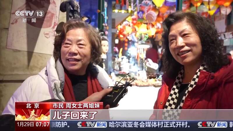 北京市民 周女士两姐妹:跟儿子一起过。儿子回来了,跟儿子一起逛庙会,吃北京的小吃,豆汁、麻豆腐、焦圈,这都是北京的最爱。大家一起团团圆圆,谈天说地,回忆这一年所走过的路程,展望未来。国家好,是家庭也好,孩子们都好,老年人生活更好。