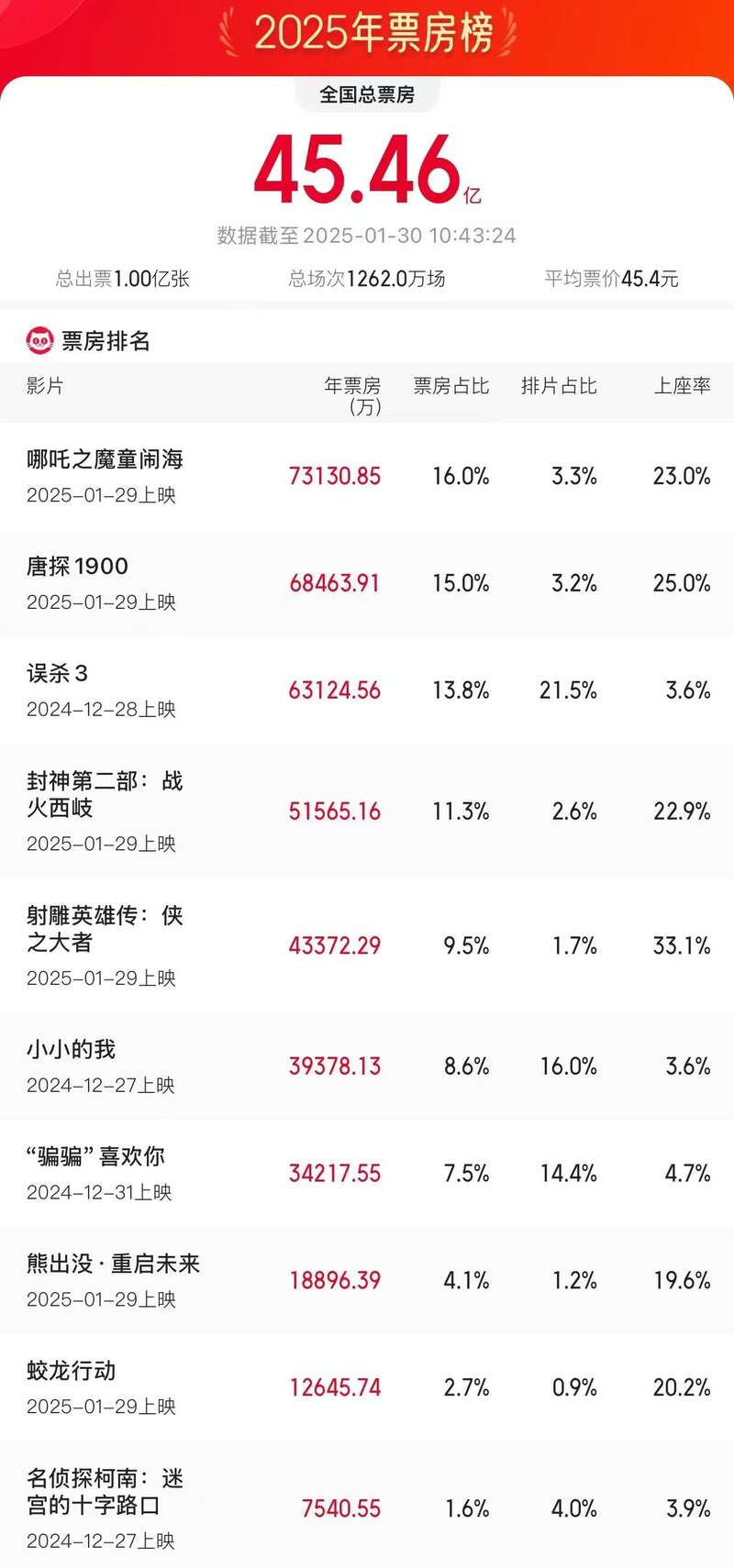 平均票价45.4元
