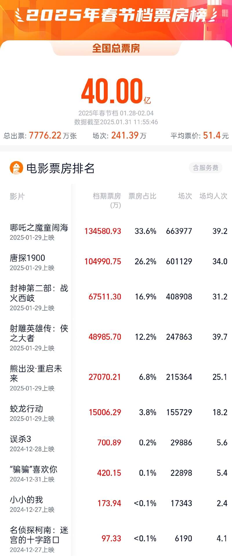 大年初一,共有六部国产新片集中上映,包括《封神第二部:战火西岐》《哪吒之魔童闹海》《唐探1900》《蛟龙行动》《熊出没·重启未来》《射雕英雄传:侠之大者》。