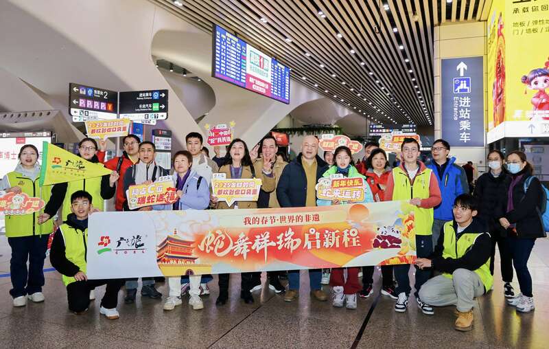 中国青年报客户端讯(中青报·中青网记者 林洁)1月29日7时许,广州南站游人如织,旅行社导游一字排开召集准备出发的游客。乙巳蛇年大年初一,旅游市场迎来春节假期客流“顶峰”,仅广之旅就有超过200个跨省游团队出发,飞机团与高铁动车团比例接近1:1,亲子游、冰雪游、文旅融合主题游、定制小团游成为游客出行的主流选项。