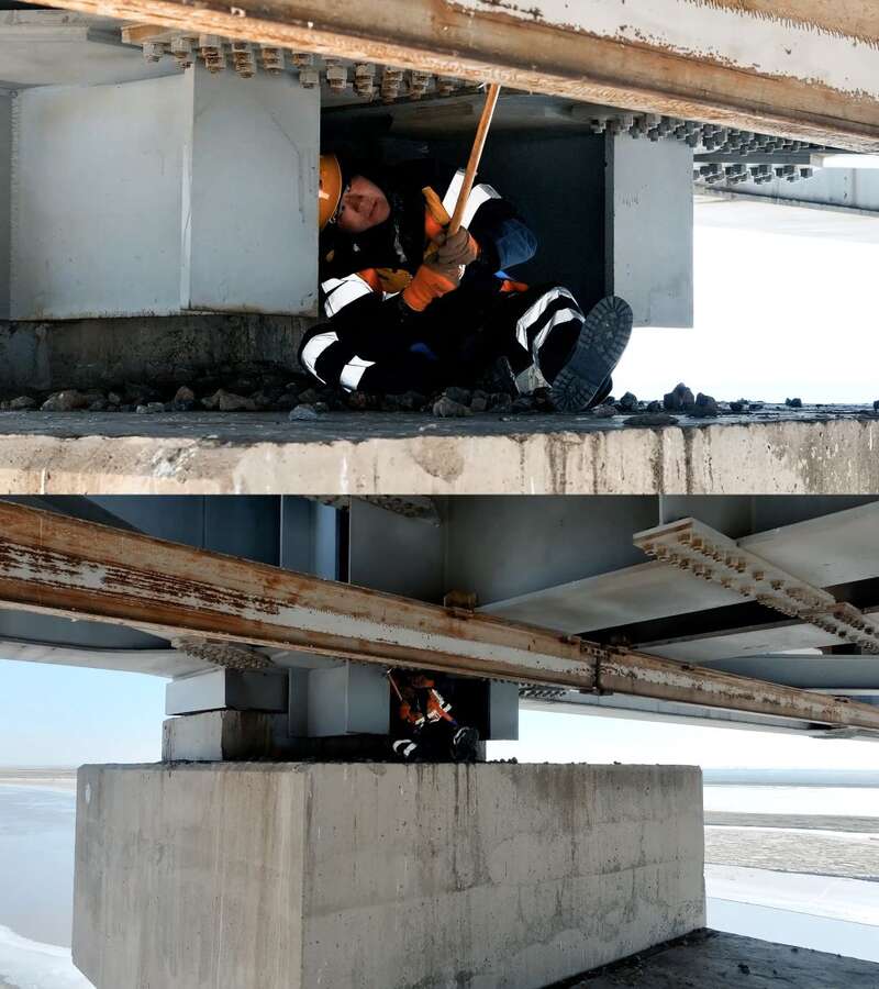 “螺栓松了很清脆,没松就是闷响,我敲你听听。”桥隧工白岳禾边说边敲着螺栓。在这个如井下一般的桥洞中,四面都是整齐的螺栓。桥下的流水声、桥洞口的风声、有节奏的敲击声……合起来像是一部乐章。而这个乐章还有下半部分。
