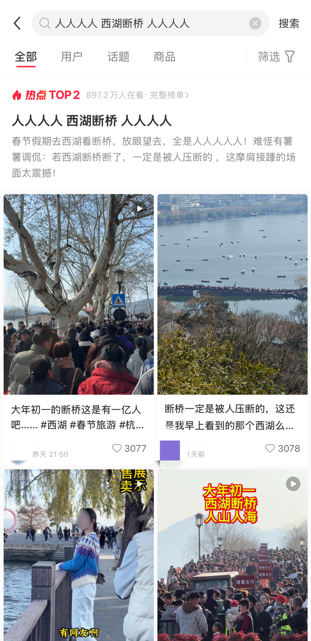 在社交平台上,当日“人人人人 西湖断桥 人人人人”的词条冲上热点TOP2:“春节假期去西湖看断桥,放眼望去,全是人人人人人!”网友调侃:“断桥一定是被人压断的。”
