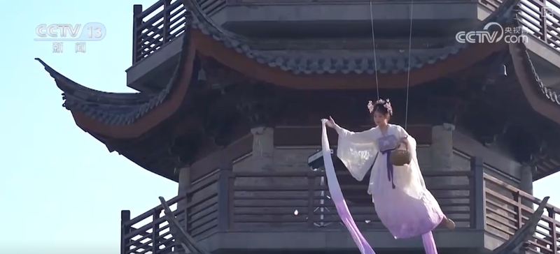 在盐城市盐南高新区珠溪古镇,随着悠扬的乐声响起,身着华服、手持花篮的百花仙子缓缓从天而降。她们舞姿优美,沿途播撒花瓣,在空中编织出一幅流动的画卷。