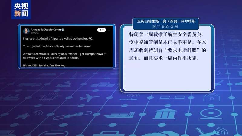 民主党众议员亚历山德里娅·奥卡西奥—科尔特斯也在社交媒体发文称,特朗普上周裁撤了航空安全委员会。空中交通管制员本已人手不足,在本周还收到特朗普“要求主动辞职”的通知,而且要求一周内作出决定。亚历山德里娅认为,造成此次撞机事故的原因不是民主党的多元化政策,而是特朗普和马斯克的裁员政策。