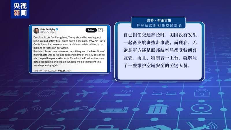 特朗普援引联邦航空局的政策称,联邦航空局在空管人员招聘要求里没有对生理和心理疾病的规定。对此,拜登执政时担任交通部长的皮特·布蒂吉格予以否认,说从特朗普首个总统任期开始、即2017年至2021年,相关规定一直都有。布蒂吉格表示,他担任交通部长时,美国没有发生一起商业航班撞击事故,而现在,无论是军方还是联邦航空局都受特朗普监管。而且,特朗普一上台,就解雇了一些维护空域安全的关键人员。