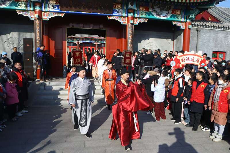投壶、捶丸、射箭等国风游乐活动和飞花令互动活动,吸引游客自发排起长队,体验参与、一试身手。舞龙、舞狮、高跷、小车会等精彩的花会展演,在慕贤广场相继亮相,怡杏轩里评剧、京东大鼓等非遗表演引得游客驻足围观,宣化阁内新开辟的庙会小剧场,皮影、变脸、魔术活动既富有传统文化韵味,又洋溢着生活气息。