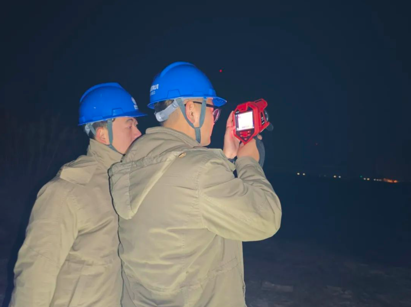 25岁的宋唯溢是第一次参加夜巡。在李海东的指导下,他拿着红外测温仪对着导线和绝缘子连接的地方逐一扫描排查。“如果有异常情况,屏幕上会出现明显亮点,那时候我们就要格外注意了。”李海东拍拍宋唯溢说,“走吧,一切正常。”