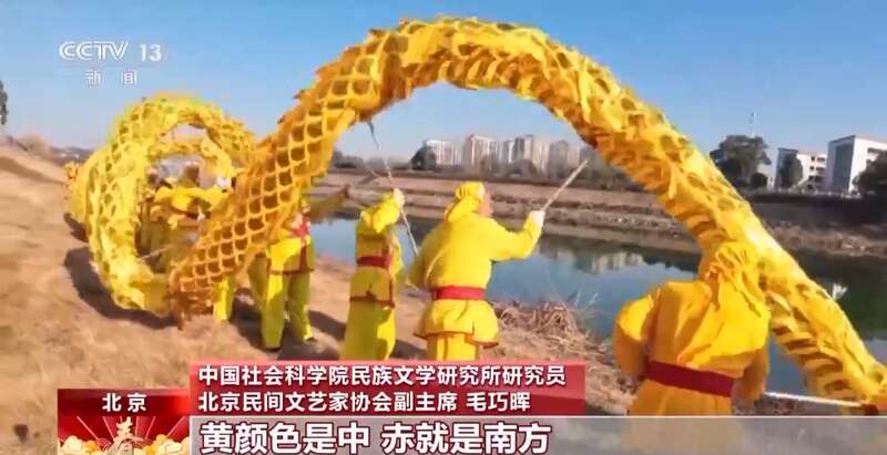 中国社会科学院民族文学研究所研究员 北京民间文艺家协会副主席 毛巧晖:黄颜色和赤色,对应的是夏天。黄颜色是中,赤就是南方,最有名的当然就是苍龙也就是青龙,它对应的是东方,也就是春天。当时是五龙相应出现,穿着不同颜色的衣服的人舞着不同颜色的龙,主要就是和当时中国的五行、金木水火土的观念相关。