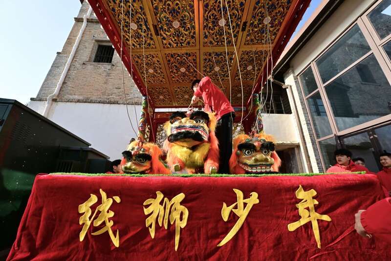 1月30日,福州市上下杭历史文化街区,受邀前来参加新春非遗表演活动的兴贤少年线狮队在演出前准备。