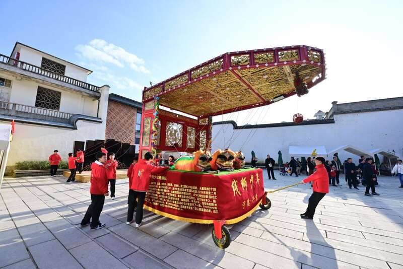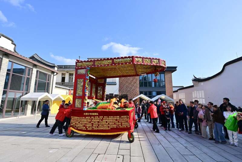 1月30日,福州市上下杭历史文化街区,受邀前来参加新春非遗表演活动的兴贤少年线狮队在演出后推着道具游街。
