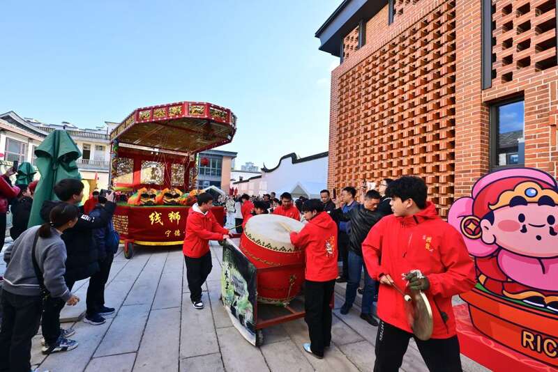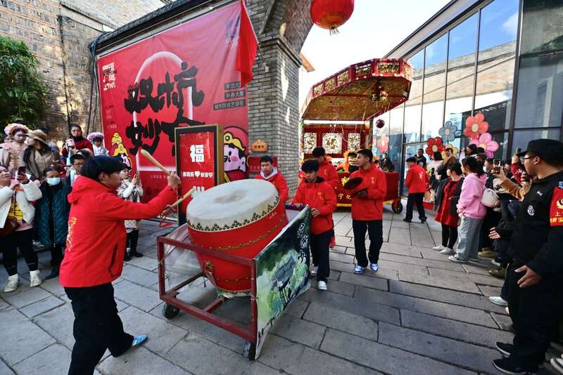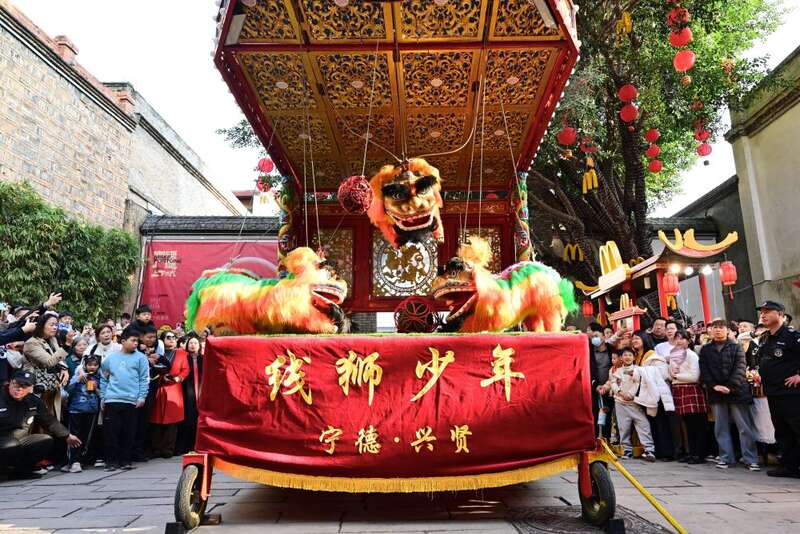 1月30日,福州市上下杭历史文化街区,受邀前来参加新春非遗表演活动的兴贤少年线狮队走进表演场地。