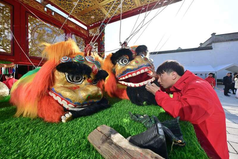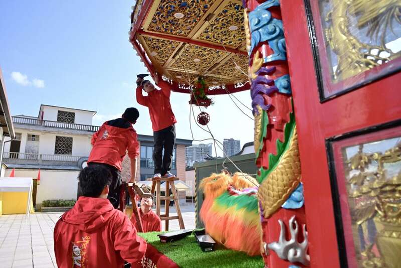 1月30日,福州市上下杭历史文化街区,受邀前来参加新春非遗表演活动的兴贤少年线狮队队长陈吉宏在演出前检查。