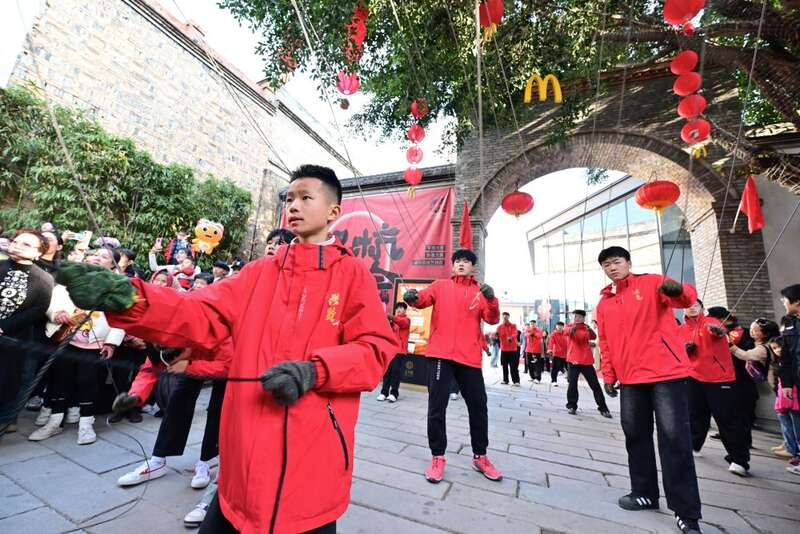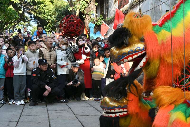1月30日,兴贤少年线狮队在福州市上下杭历史文化街区表演。